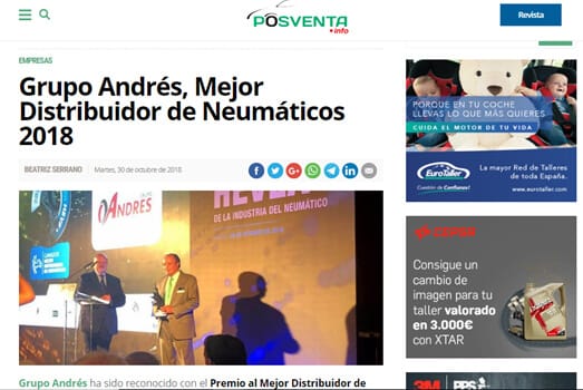 Tanto medios generalistas como especializados, nacionales e internacionales, prensa, medios on line y audiovisuales, se han hecho eco en los últimos días de los Premios Hevea y, en concreto, del Premio al Mejor Distribuidor de Neumáticos otorgado a Grupo Andrés.